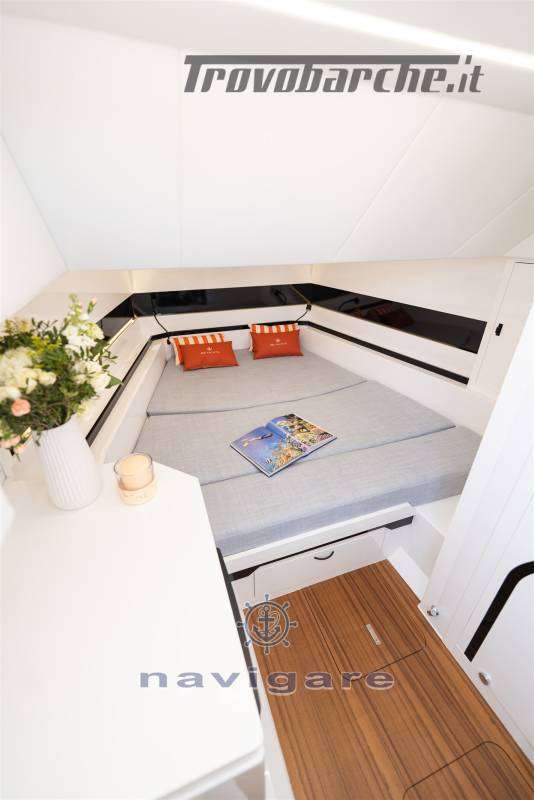 CABINA DI PRUA • Cuccetta doppia con materasso • Illuminazione a soffitto • Armadietti appendiabiti • Luci di lettura con USB* • Illuminazione d'atmosfera • Pompe di sentina automatiche • Lavello con acqua calda e fredda* • Frigorifero* • Piano di lavoro in Corian • Pensili • Prese 230 V e USB • Cassetti portaoggetti • Illuminazione ambientale