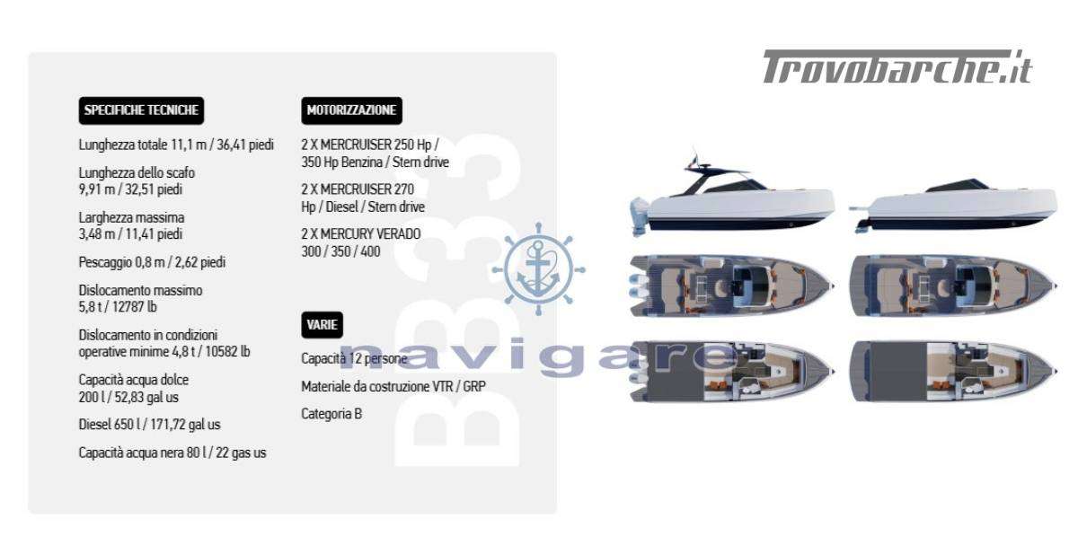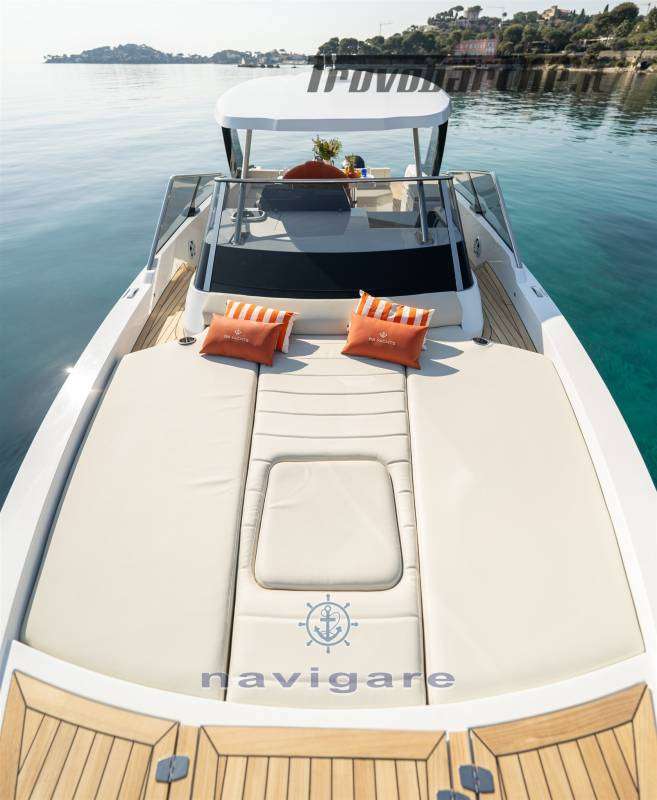 VANO TECNICO • Isolamento termo-acustico • Cofano motore ad azionamento elettrico • Impianto antincendio in sala macchine • Pompe di sentina automatiche • Capacità serbatoio carburante: 640 litri • Valvole carburante con chiusure di sicurezza al timone. - Capacità del serbatoio dell'acqua: 200 litri - Pompa di lavaggio del ponte dell'acqua dolce* - Pompa dell'acqua dolce* - Serbatoio dell'acqua sporca da 80 litri con pompa - Punto di scarico del serbatoio di scarico sul lato del ponte. • 2 batterie motore AGM • 2 batterie servizi AGM • Generatore da 4 kW con batteria* • Batteria AGM aggiuntiva* • Impianto di climatizzazione: 12.000 BTU*