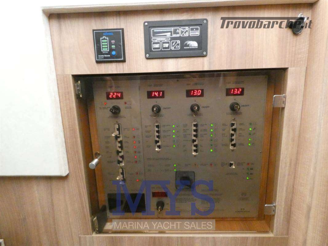 Scafo colore celeste.Informazioni aggiuntive: Cuscineria Pozzetto; Pozzetto Teak; Tromba; Ancora; Allarme motore; Telo copriconsolle; Telo coprisedile; WC marino elettrico; Porta ingresso; Caricabatterie; Luci subacquee; Auto-Trim; Colorazione speciale; Joystick; BBQ/ Grill; Luci di cortesia; Piastra in vetroceramica; Altoparlanti; Tavolo pozzetto; Comando motori elettronico; Pannelli Solari; Radio AM/FM; Pavimento interno in legno; Tavolo Salone Abbattibile; Serbatoio Acque Nere;