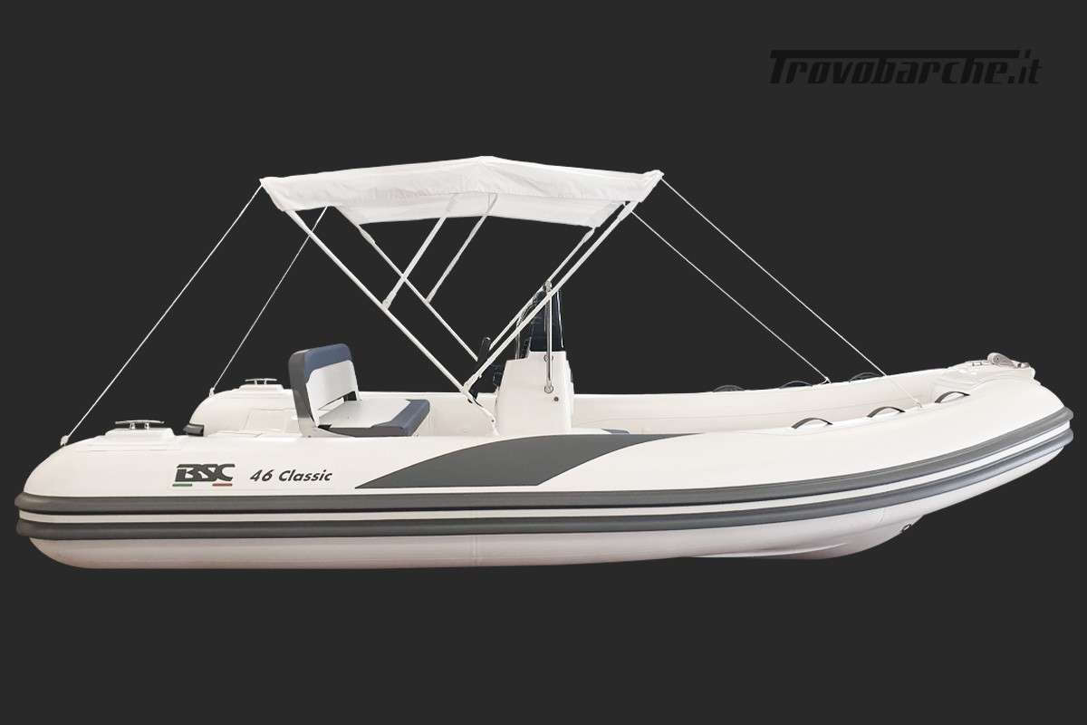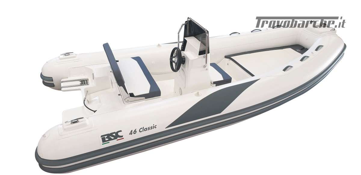 The BSC 46 is the perfect model for those looking for a compact, easy-to-handle inflatable boat that offers comfort and excellent performance. Ideal for day trips, family outings, or relaxing moments at sea, this boat combines quality construction, functional design, and excellent stability. Easy to transport (on a trailer) and launch. Low fuel consumption, even with 40 HP engines, which can be driven without a boating license. Stability and safety even in rough seas. Ideal for those new to boating or for practical and fun summer use. Standard equipment: Full console: ergonomic design with mechanical steering and integrated windshield Full closed cell cushions: quick-drying and water-resistant material Seat in front of console: comfort and support for the helmsman, stern backrest: for greater comfort of passengers, stern platforms: facilitate access to the water and re-boarding Towing and mooring hooks: for easy management of maneuvers, water tank: for toilet use and optional shower, bilge pump: to keep the interior dry, electrical panel: centralized management of the systems, complete electrical system: with pre-installed wiring and connections, inflator: for the correct inflation of the tubes Ladder: to facilitate entry and exit from the water Repair kit: for quick repairs in case of need Optional equipment: Stainless steel roll bar: with LED lights and horn Sun awning: with stainless steel arches Bow sundeck extension: for more relaxation space Deluxe cushions: two-tone Off White / Grey Upholstery EVA synthetic: for the floor Full cover: for console and mooring ENGINE PACKAGE TO INCLUDE: SUZUKI DF 40 easy: €20,500.00 + VAT YAMAHA F40 HETL: €20,800.00 + VAT