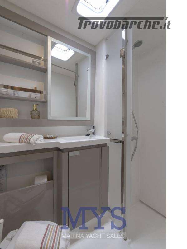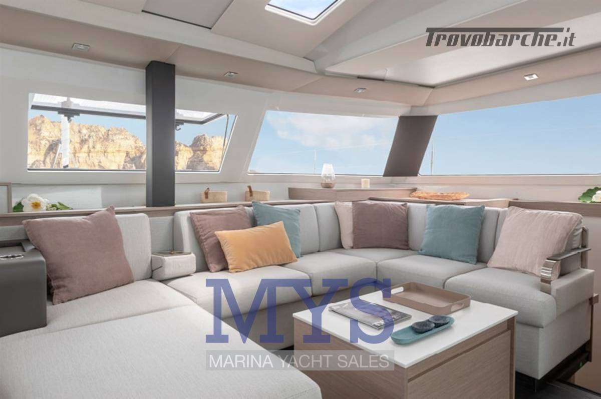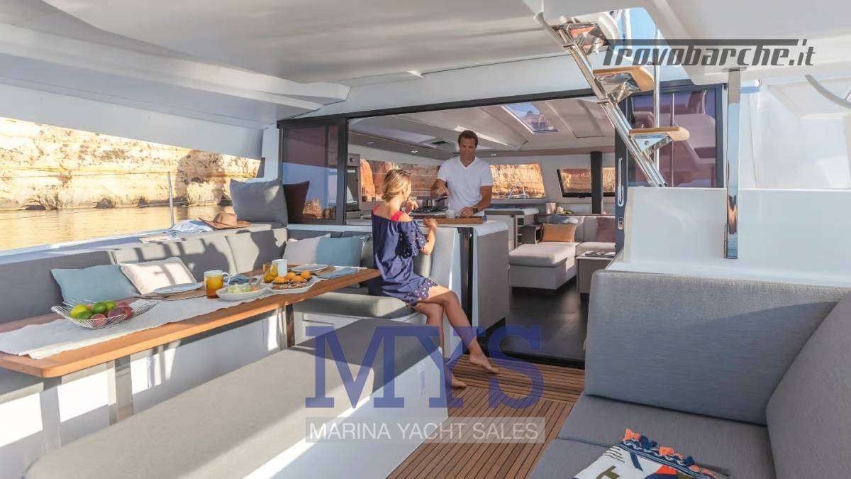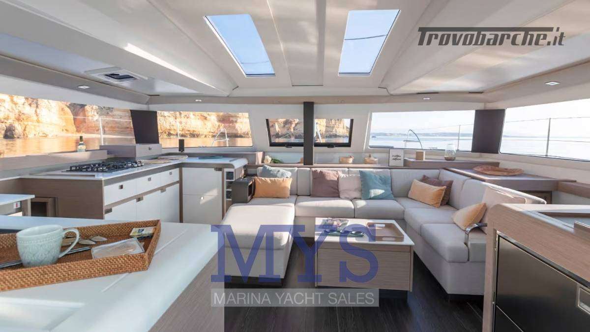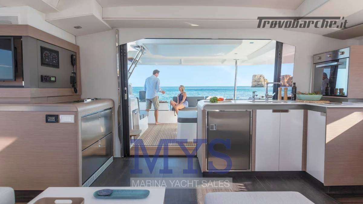 Ampio pozzetto a filo con dinette interna open space, cucina completa e luminosità a 360°. La sensazione è quella di un 50 piedi, con costi di gestione più contenuti.