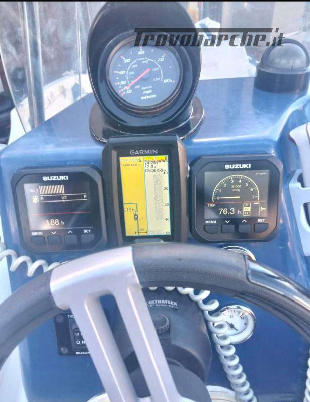L’imbarcazione è motorizzata con un potente e affidabile Suzuki DF 200 A fuoribordo a benzina, anno 2017, con circa 188 ore di moto, sempre mantenuto con cura e sottoposto all’ultima revisione completa nel 2023, comprensiva di cambio olio, filtri, girante e controlli generali. Le prestazioni sono di assoluto livello: velocità massima di circa 33/35 nodi e una velocità di crociera ideale intorno ai 22 nodi, che permette di navigare in modo confortevole e con consumi equilibrati. Il serbatoio carburante da 150 litri e quello dell’acqua dolce da 50 litri garantiscono un’ottima autonomia per lunghe giornate in mare.