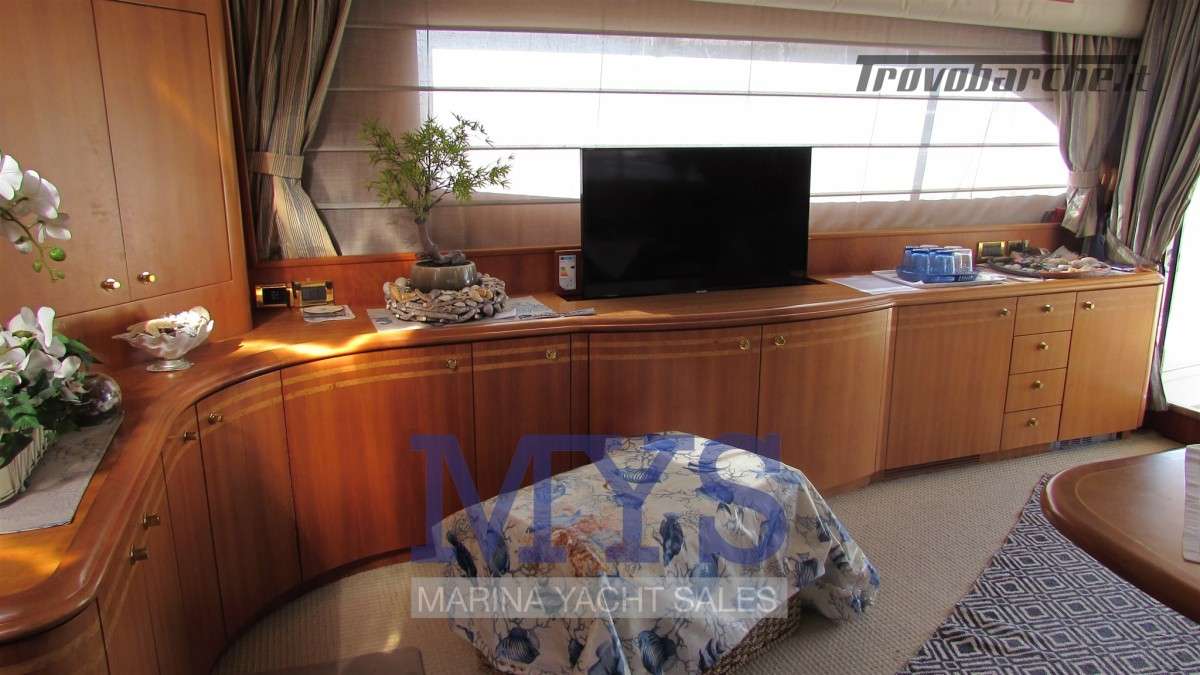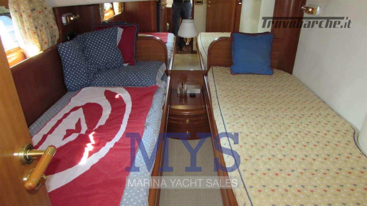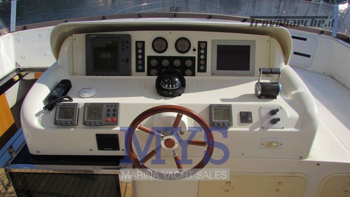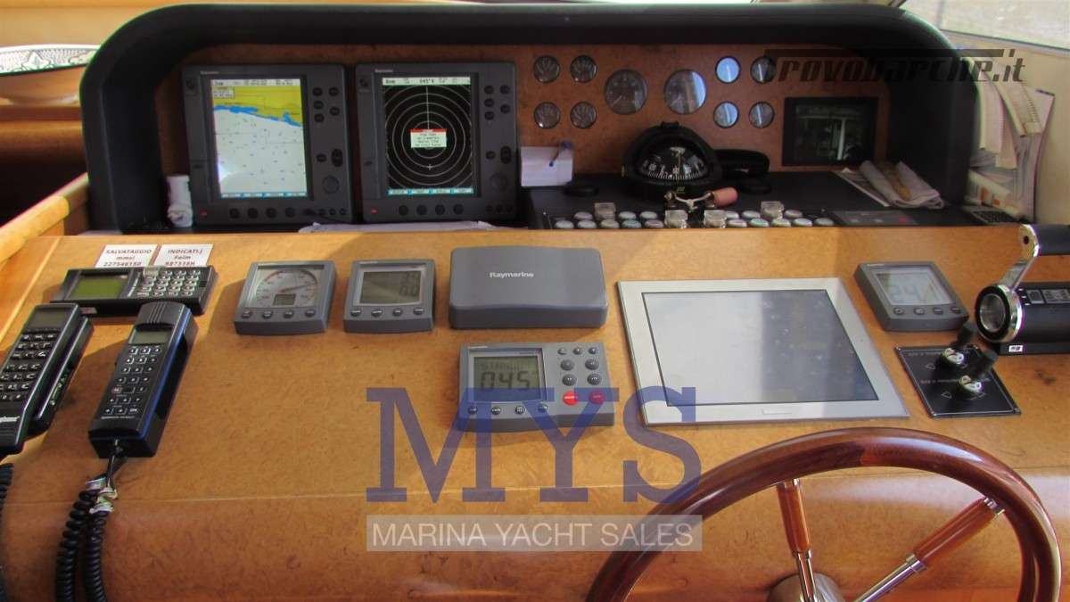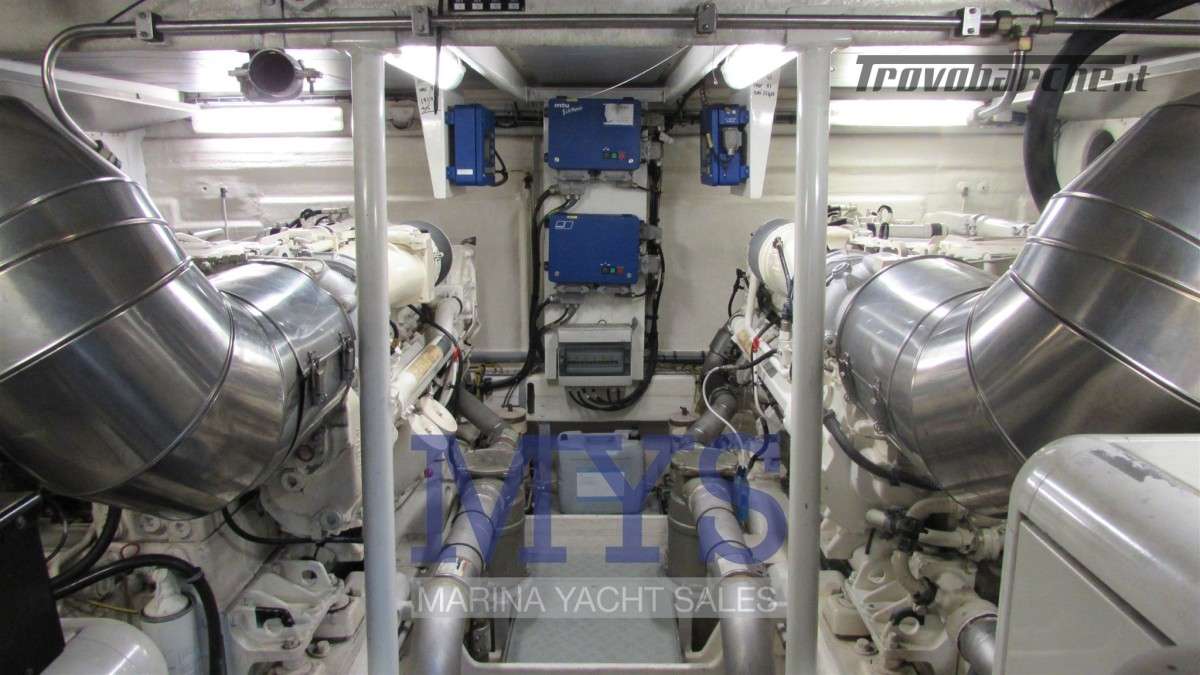 Sistema di ventilazione sala macchine.Informazioni aggiuntive: Condizioni prezzo: BUONE CONDIZIONI GENERALI; Cassaforte; Cuscineria Pozzetto; Pozzetto Teak; Tromba; Allarme motore; Telo copriconsolle; Fornello; Indicatori Flaps; WC marino elettrico (4); Camminamenti laterali in teak; Porta ingresso; Porta laterale (2); Caricabatterie (2); Luci subacquee; Sistema Depurazione acque nere; Antenna Satellitare TV; BBQ/ Grill; Display; Luci di cortesia; Antenna radar; Plotter con antenna GPS; Presa acqua banchina; Gruette per tender su fly; Altoparlanti; Tavolo pozzetto; AIS; DSC vhf; Comando motori elettronico (3); Winch Elettrico (2); Radio AM/FM; Ripetitore strumentazione (3);