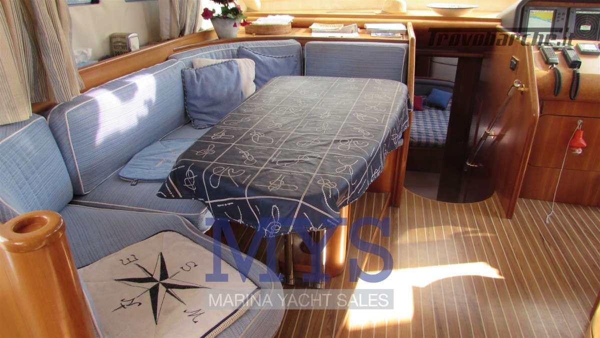 Dispone di un ampio salone sul ponte principale con divano a forma di U, tavolino basso e sgabelli, più a prua si trova la cucina chiusa a dritta, la postazione di guida principale e un generoso tavolo da pranzo a babordo con divano a L e sgabelli. Sottocoperta ci sono quattro spaziose cabine, una Master a tutto baglio, con bagno privato completo di bidet e doccia con idromassaggio, una cabina VIP a prua con bagno e due cabine ospiti doppie con letti singoli in piano a dritta e a sinistra. A prua l'alloggio dell'equipaggio con due letti in piano e bagno. A poppa locale tecnico con lavanderia ed accesso sala macchine.