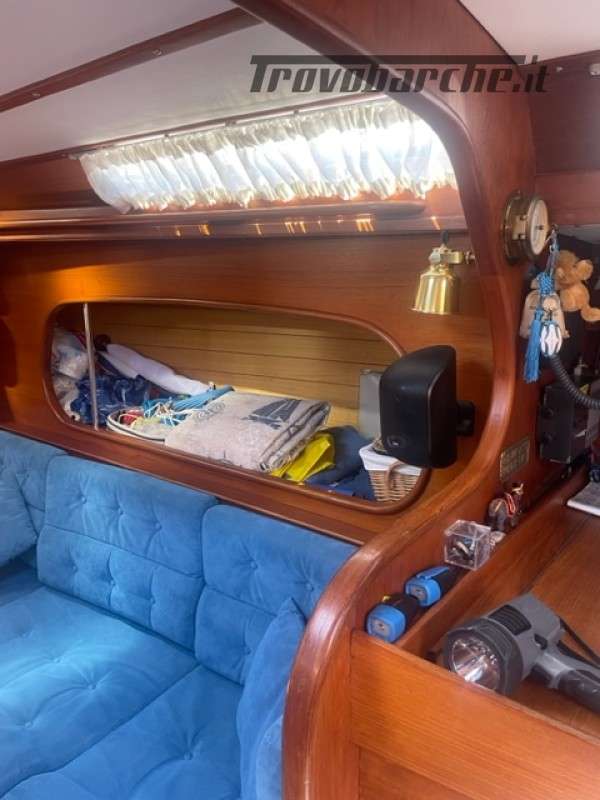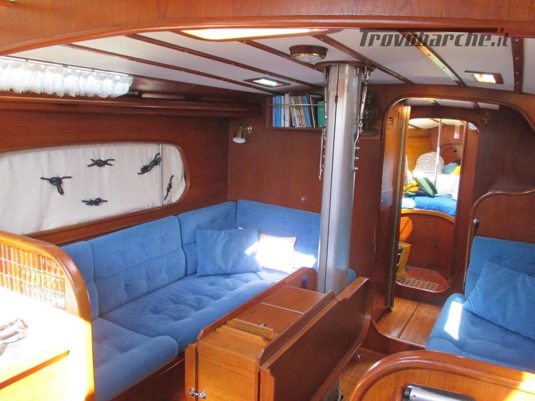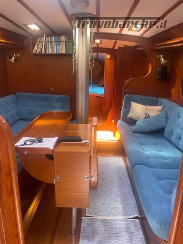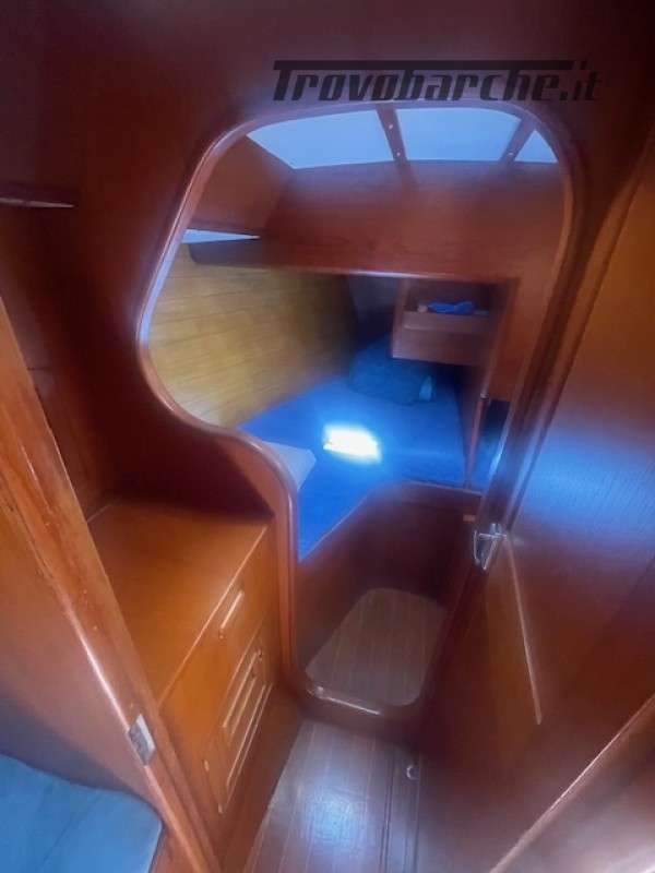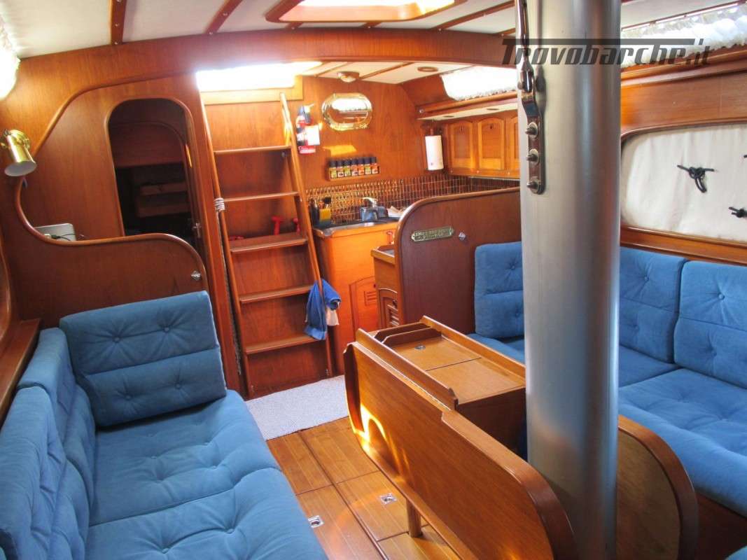 Entrata in dinette molto ampia con a dx cucina a C rinnovata nel 2016 completa di frigo forno e fuochi e ampie dispense, a sx tavolo carteggio ed entrata zona poppiera divisa in due cabine una king size e una doppia .l’ampia dinette con tavolo centrale estendibile con due divani contrapposti e due cuccette di guardia rialzate. Dopo l’albero passante il bagno con ampio calpestio e cabina di prua doppia . Tutti i i legni sono stati smontati e refittati come i cieletti e le tappezzerie tornando all’eleganza iniziale .