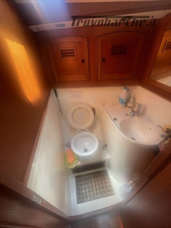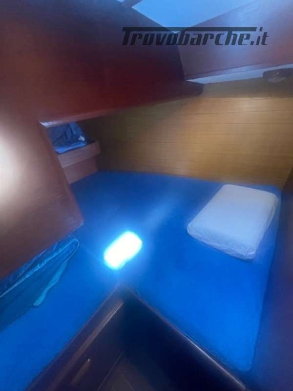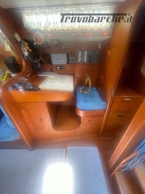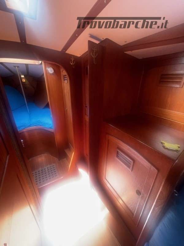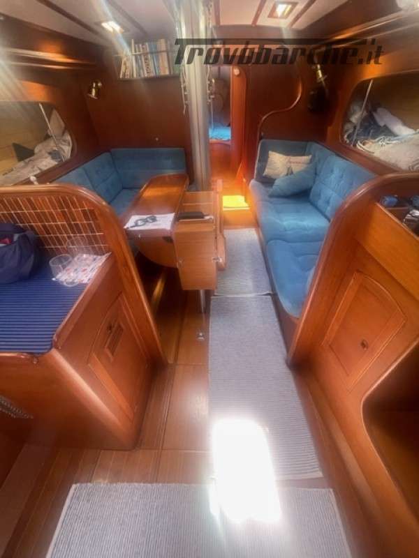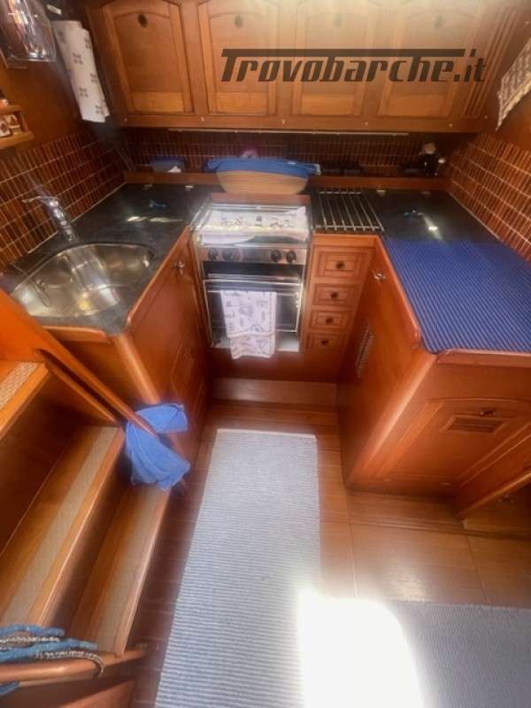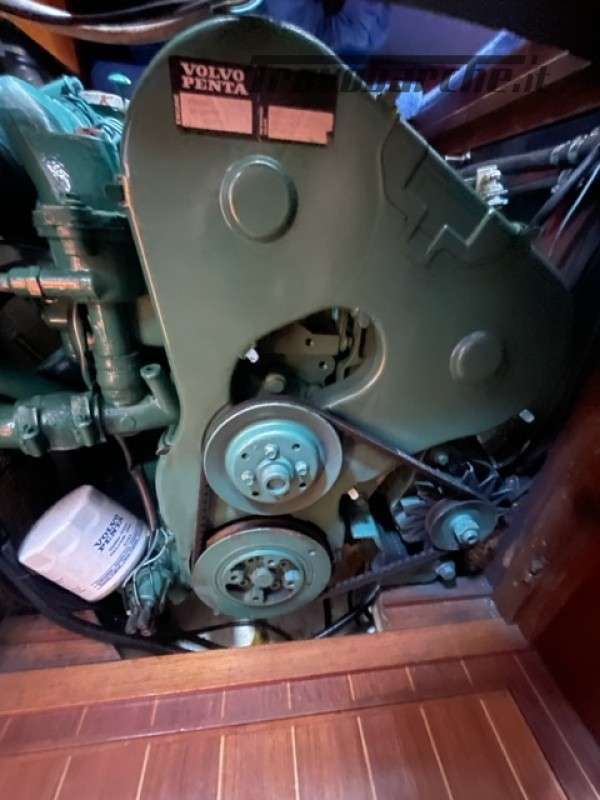 Entrata in dinette molto ampia con a dx cucina a C rinnovata nel 2016 completa di frigo forno e fuochi e ampie dispense, a sx tavolo carteggio ed entrata zona poppiera divisa in due cabine una king size e una doppia .l’ampia dinette con tavolo centrale estendibile con due divani contrapposti e due cuccette di guardia rialzate. Dopo l’albero passante il bagno con ampio calpestio e cabina di prua doppia . Tutti i i legni sono stati smontati e refittati come i cieletti e le tappezzerie tornando all’eleganza iniziale .
