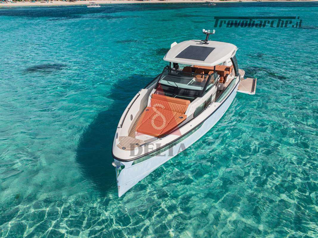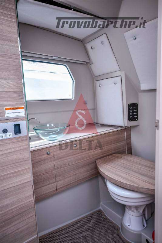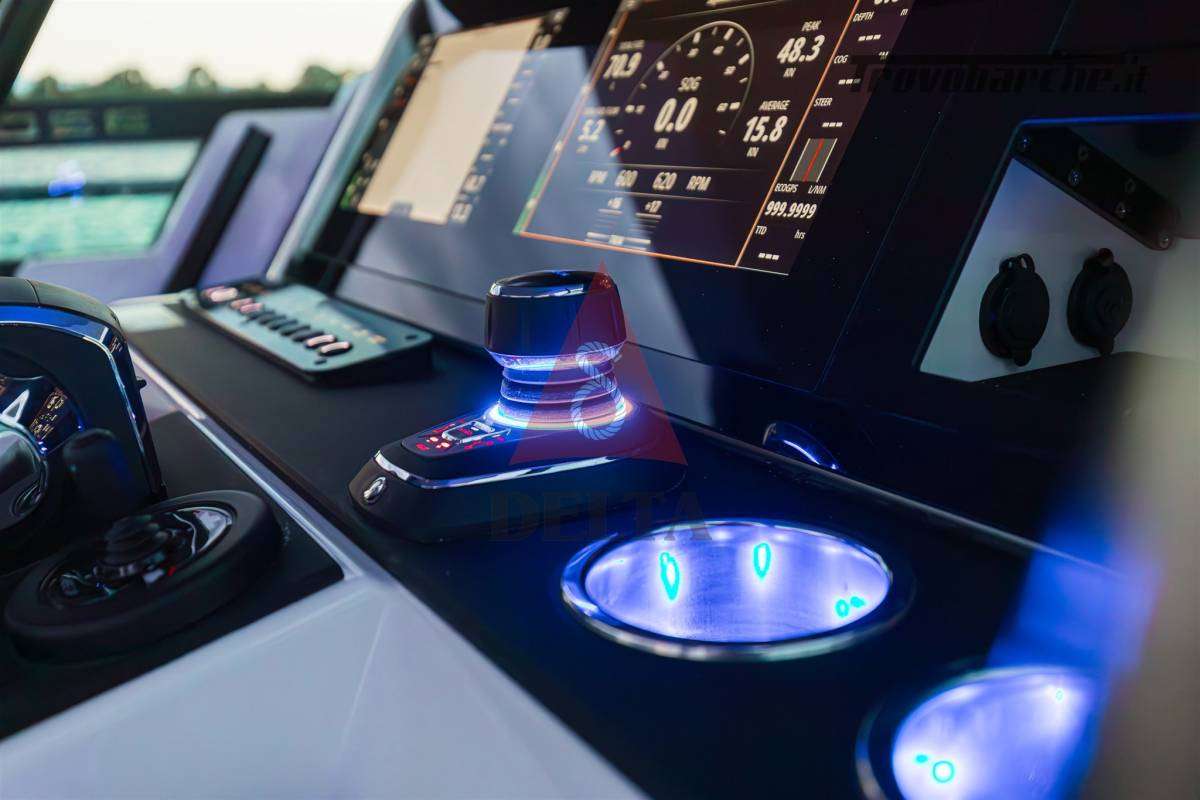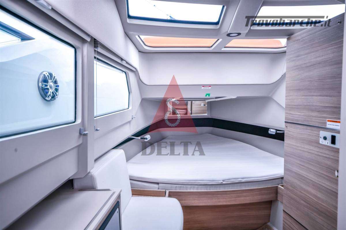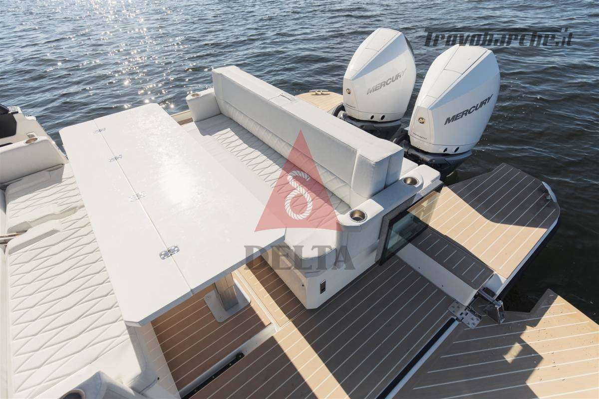 Terrazze laterali ad apertura elettrica (max carico 150 kg) - Mobile Wet Bar - Cuscineria di Prua - Finiture antiscivolo sui ponti e portelli - Corrimano integrati sulla coperta - Alette laterali fisse per facile imbarco laterale - Scaletta da bagno telescopica - Portelli sul ponte anteriore per un facile accesso - 2 x Portelli da incasso - Maniglie e Bitte - Sistema di sgancio rapido dei parabordi - Contenitore estintore con portello antincendio - Tavolo allungabile con gamba telescopica - Specchio nella cabina anteriore - Adesivi sullo scafo - Volante in pelle - Portabicchieri nella consolle e per