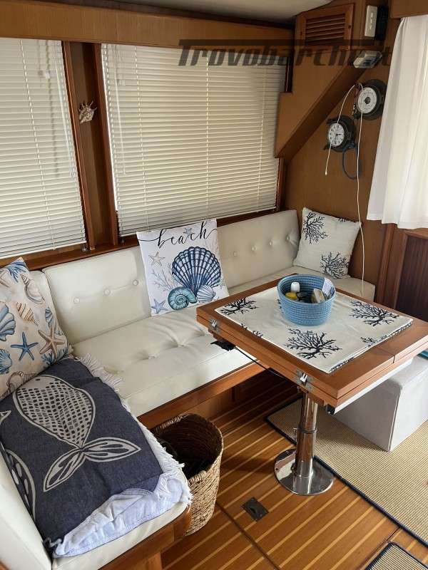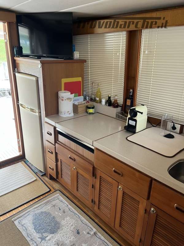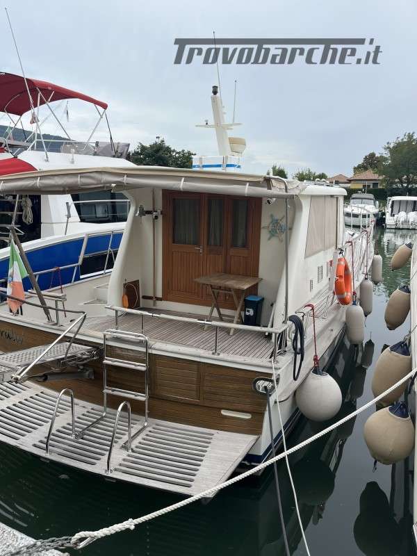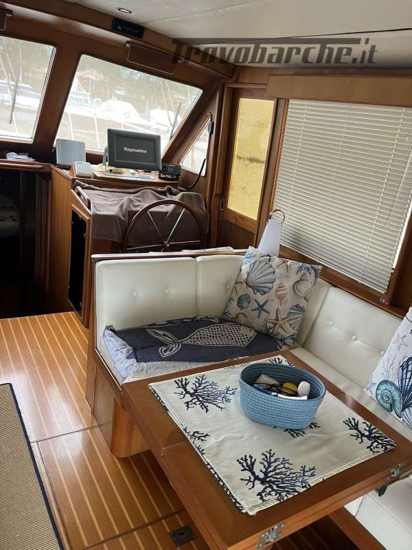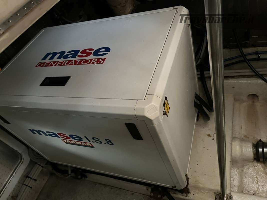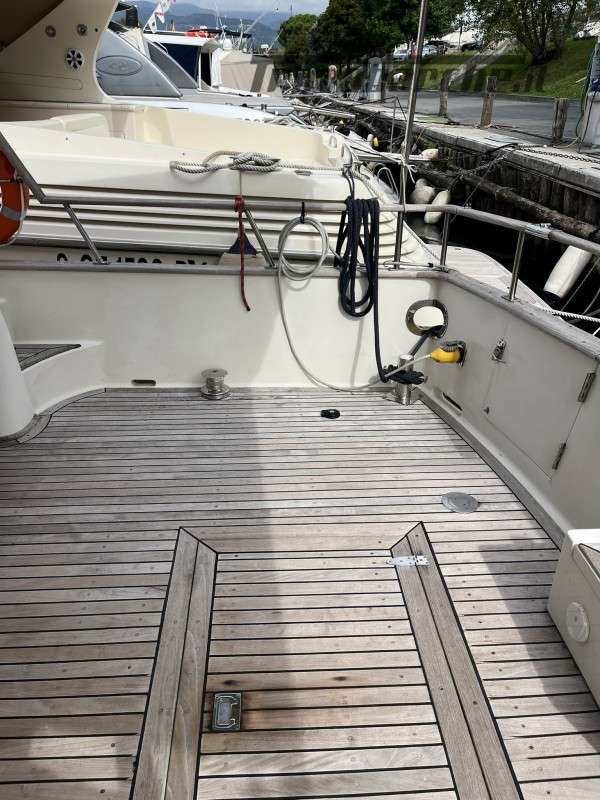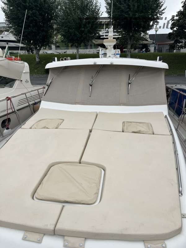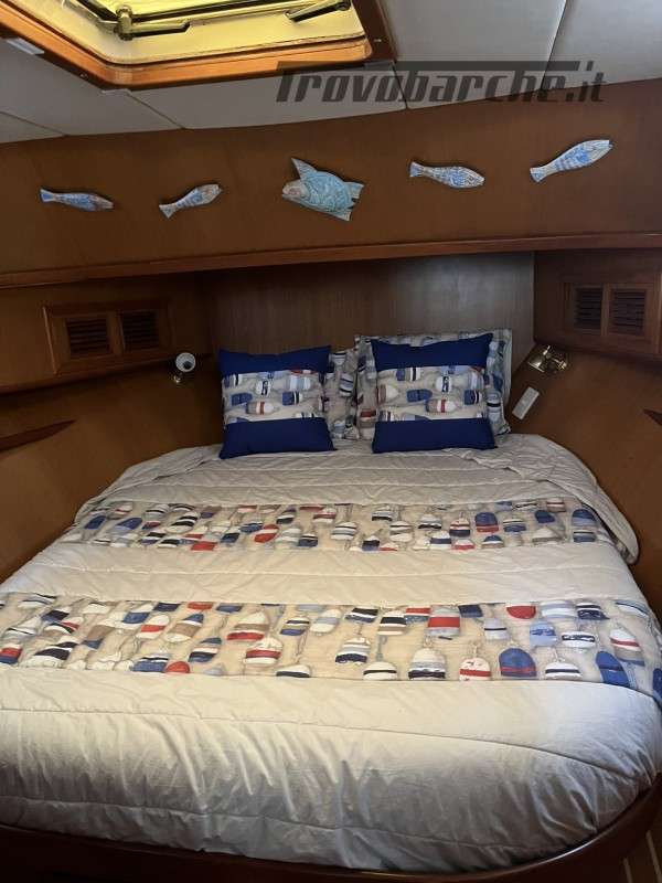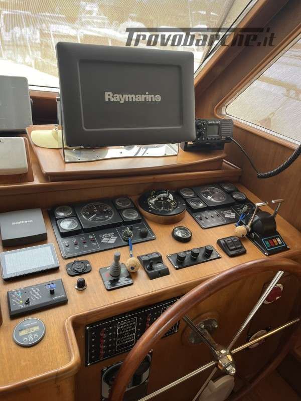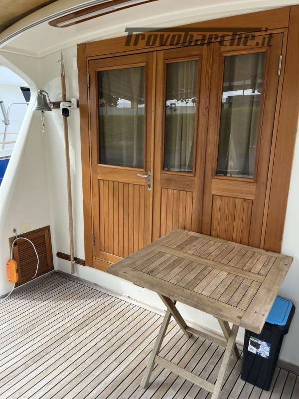 Dotazioni: Aria condizionata in dinette e nelle cabine, elica di prua, gruppo elettrogeno Mase 6kw, angolo barra, bussola, manette elettroniche, contamiglia, ecoscandaglio, GPS, Radar su secondo GPS, log, radio VHF, autoclave, wc marino Tecma elettrico, doccia esterna, elica prua, doppio comando salpaancora in plancia e a prua, passerella idraulica, flaps idraulici, impianto antincendio in sala macchine, sensori fuoco, temperatura e livello acqua sentina, piattaforma con scaletta bagno, pompe sentina automatiche, porte laterali, pozzetto e coperta in teak, presa 220 banchina, sistema combinato inverter, caricabatterie, pannelli solari e banchina victron, salpa ancore elettrico con doppio comando, winch tonneggio a poppa, prese interne 220 in ogni ambiente, stereo e altoparlanti, cucina a gas, microonde, frigo, ombreggianti laterali e posteriori in pozzetto, oscuranti vetri laterali e plancia estivi e invernali, tendalino copripozzetto, tender e motore Honda 2.3