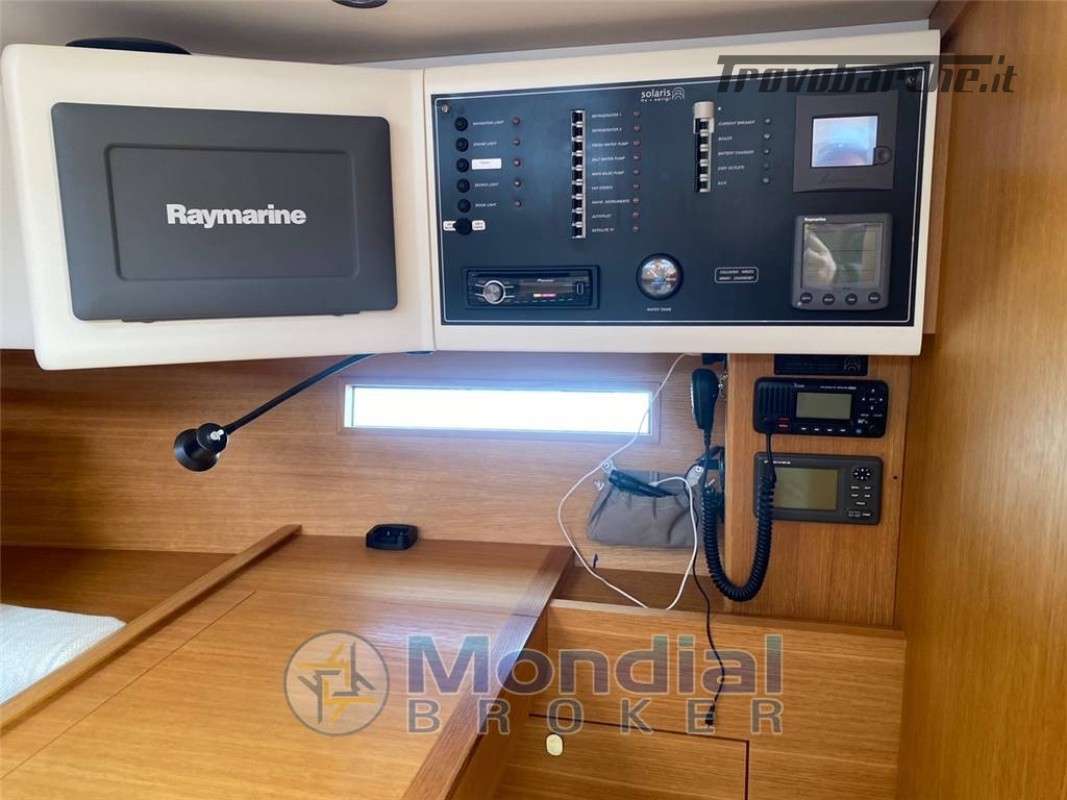 • The Solaris One 44 has a layout with three cabins, two bathrooms, saloon with galley, a sofa, a dining table and a chart table. The chart table is practical and placed near the companion way.